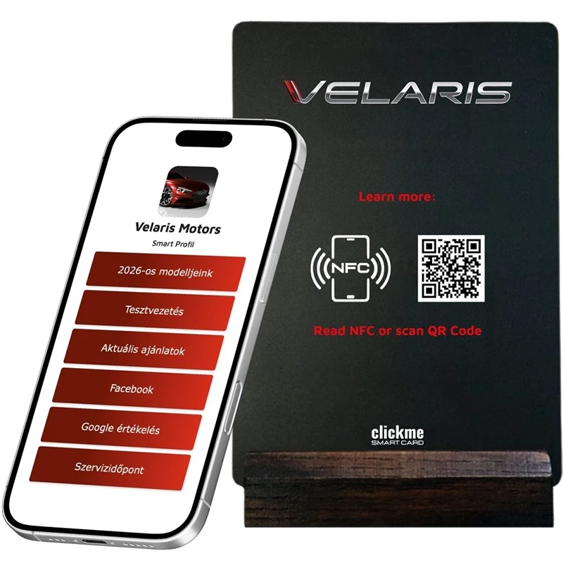 Asztali smart display vagy QR/NFC pont, ahol az ügyfél egy érintéssel eléri: